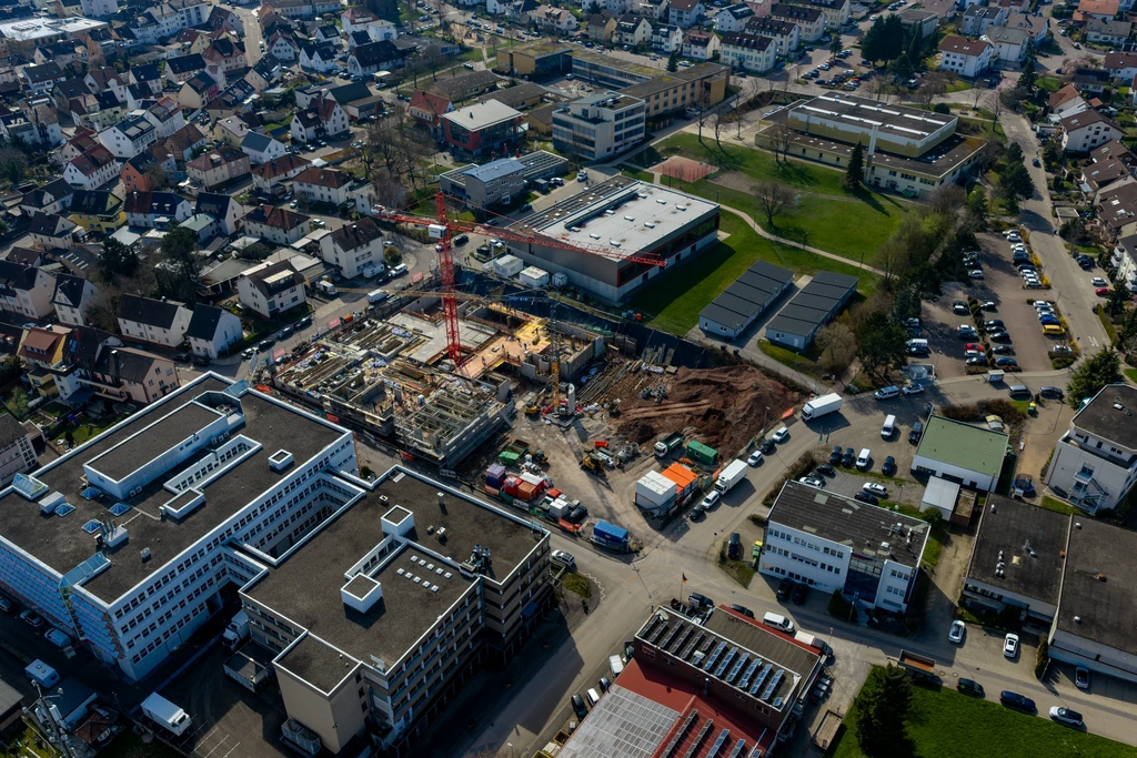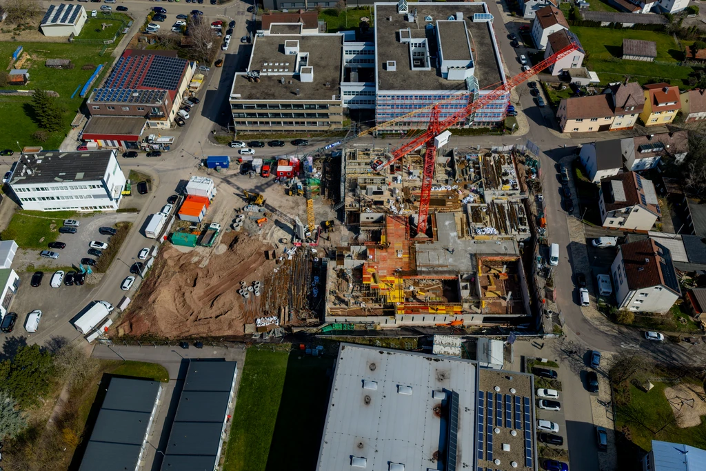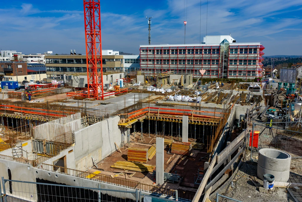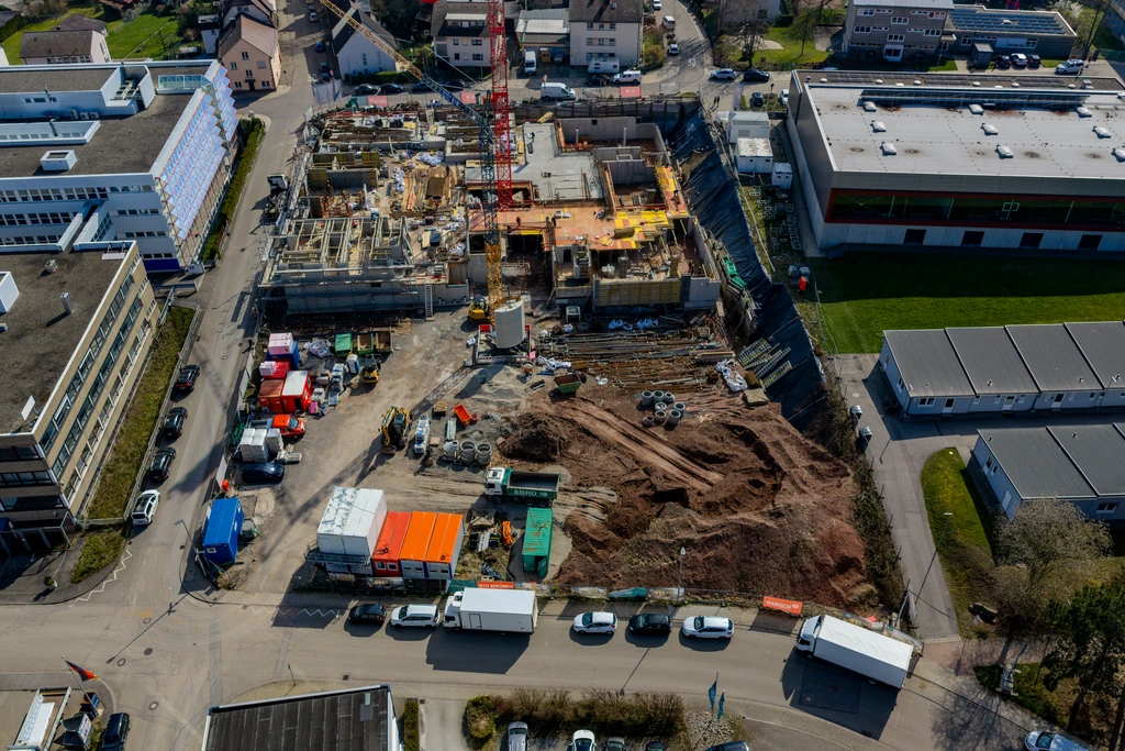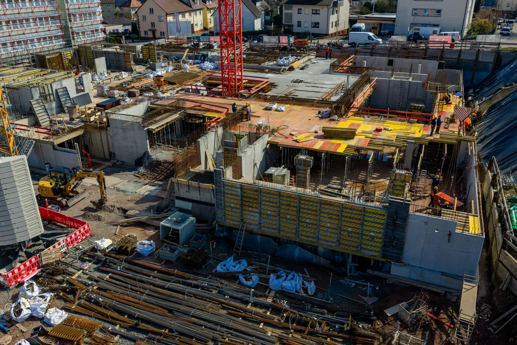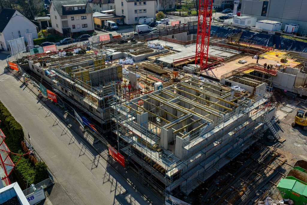 Der Rohbau von Bauabschnitt I schreitet gut voran. Die Arbeiten an der Tiefgaragendecke sind in vollem Gange – etwa die Hälfte der Decke ist bereits fertiggestellt. Im Haus 1 ist der Rohbau des Erdgeschosses abgeschlossen, aktuell wird an der ersten Obergeschoss-Ebene gearbeitet.