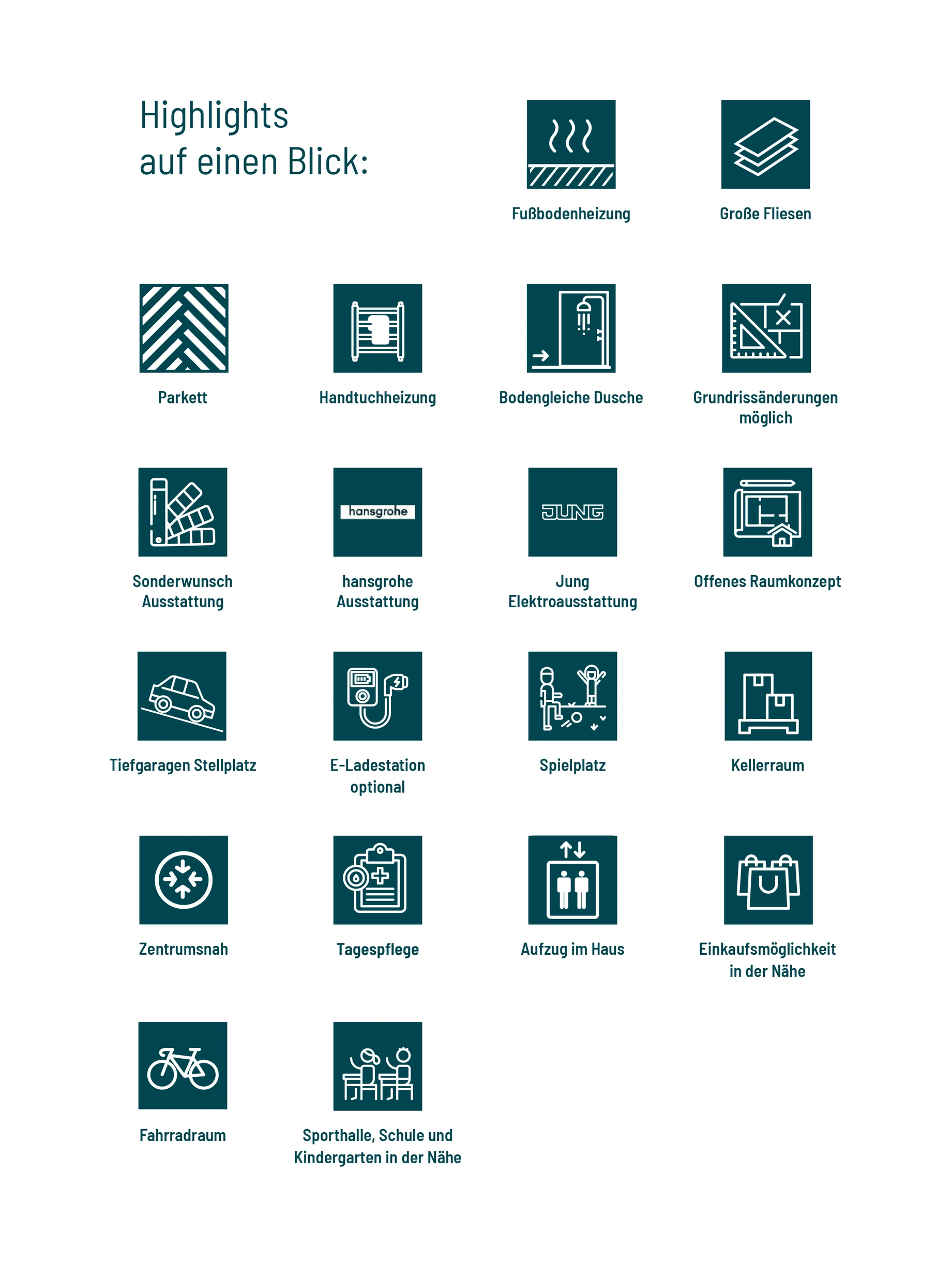 Unsere Wohneinheiten werden standardmäßig bereits mit Fußbodenheizung, Echtholzparkett von MEISTER in den Wohnbereichen und Fliesenbelägen von Atlas Concorde in Bad und Küche ausgestattet. Mit stilvoller Badkeramik von LAUFEN und KALDEWEI sowie Badarmaturen in klarem, modernem Design von hansgrohe schaffen Sie sich Ihr Wohlfühlzuhause.